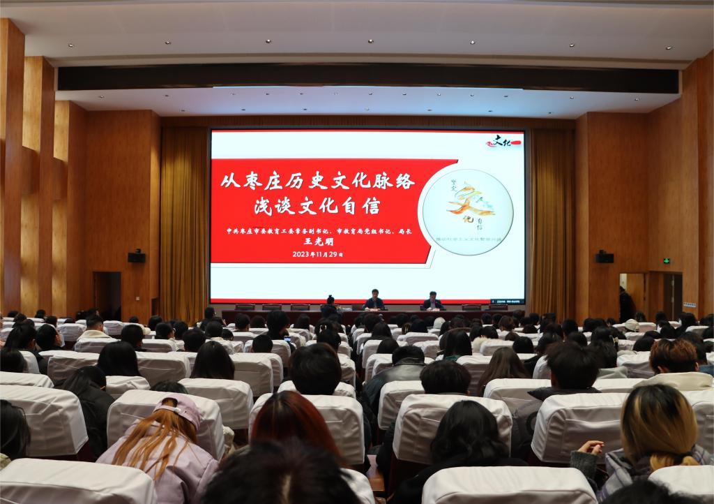 王光明局长以“从枣庄历史文化脉络浅谈文化自信”为题,深刻阐述了习近平文化思想的精髓要义,从“时、空、人”三个纬度全面剖析枣庄历史文化,深刻阐述了文化自信在国家建设、民族复兴中的重要作用。王光明强调,文化自信不仅是对自身文化的认同和自豪,更是对未来发展的信心和动力。他通过分析枣庄历史文化的特点和发展历程,指出枣庄人民在历史长河中积淀了丰富的文化底蕴,孕育出了众多优秀的文化成果,形成了诚实守信、精益求精、自强不息、开放包容、重教求实、守正创新的城市精神,鉴往知今,为我们在新时代发展枣庄、繁荣枣庄提供了强大的精神动力。
