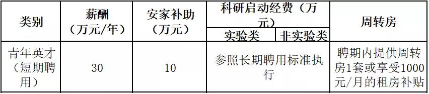 短期聘用人才聘期一般为3-5年,聘期内实行协议薪酬制。学校与短期聘用人员签订聘用合同,明确目标任务,若聘期内超额完成合同规定的工作任务,协议薪酬可上浮。上浮金额依据合同约定标准确定,最高不超过20万元/年。学校为人才提供安家补助、科研启动经费;聘期内,提供周转房(或租房补贴),缴纳社保,发放福利。