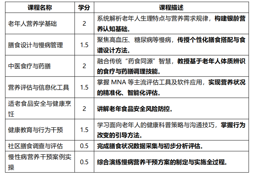 2.精准对接产业需求:课程设置紧贴养老机构、社区健康服务、适老食品开发等岗位实际,强化“精准营养评估—个性化膳食设计—慢病干预—健康科普”全链条服务能力培养。