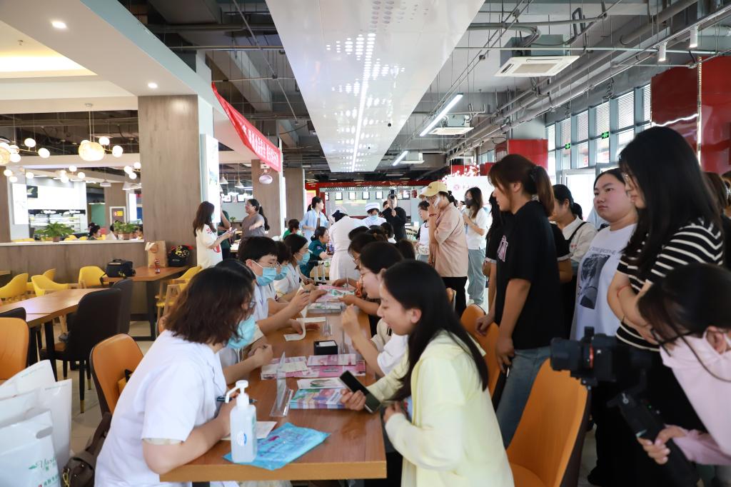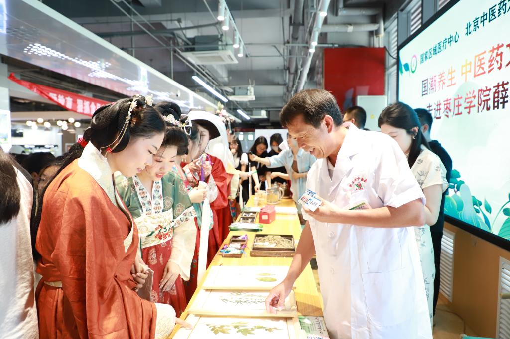 市集内中医养生及中医药文化宣传活动精彩纷呈,从切脉义诊到中药茶饮,从点穴推拿到砭石刮痧,浓郁的中医药文化氛围扑面而来,四周弥漫着淡淡的草药香气。医护人员将应急急救知识的多项内容进行了集中宣传,并为学生们现场演示心肺复苏有关操作。中医药产品展示区和中草药文化科普区内,主任药师王祥领被一群身着汉服的姑娘团团围住,他热情地向大家介绍膏方的适用人群和服用说明、中药材辨别和科普讲解,让大家了解中药性状、性味,如何合理、安全用药。中药香囊制作环节,通过丰富的活动和互动体验,广大师生群众对中医药传统文化产生了更加浓厚的兴趣。以中医药之美浸润校园、化育人心,让青春在中医药文化的薪火相传中精彩绽放。