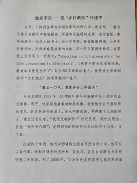 活动累计征集13份作品。参赛作品通过鲜活的事例诠释了“五老”深耕育人沃土的坚守,细腻的笔触中饱含着对老一辈奋斗者的崇敬,字里行间展现青年学子勇担时代使命的坚定决心。其中,23智慧养老专科3班董雨童作品《烛光不灭--记“乡村教师”叶连平》聚焦乡村教师叶连平的烛光人生,通过“百岁课堂”“教室即家”等故事书写老一辈教育工作者的赤子情怀。评委从主题深度、立意创新、情感表达等多维度综合评审,择优选报6份作品参加校赛。