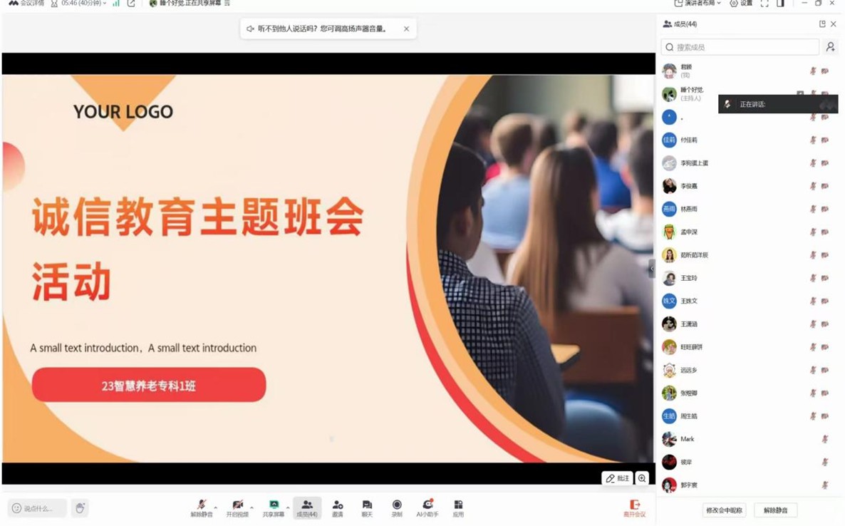 此次“诚以立身,信以启智”诚信教育主题班会的圆满成功,不仅提升了学生的诚信意识与道德素养,更进一步促进了学院优良育人氛围的建设。未来,我院将持续探索创新教育模式,深化诚信教育内涵,为培养德才兼备的新时代青年、营造崇德向善的校园文化注入持久动力。