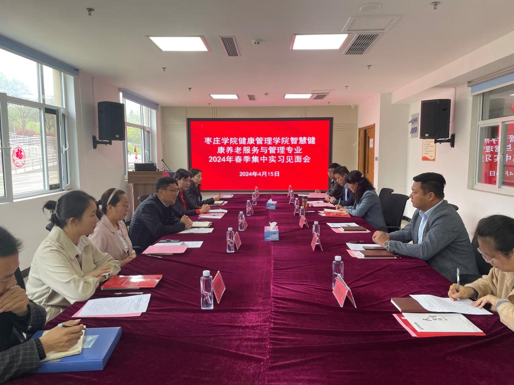 为深入推进枣庄“榴枣归乡”工程实施,进一步提高学生实践能力,4月15日,太阳成集团tyc33455ccww在枣庄亲和源康养中心一楼会议室召开智慧养老服务与管理专业2024年春季集中实习见面会。薛城区政府副区长周海燕,薛城民生集团党委书记、董事长孙延伟,薛城民生集团党委副书记、总经理王磊,太阳成集团tyc33455ccww党委书记丁聪,枣庄亲和源老年服务有限公司负责同志及学院相关教师出席见面会。