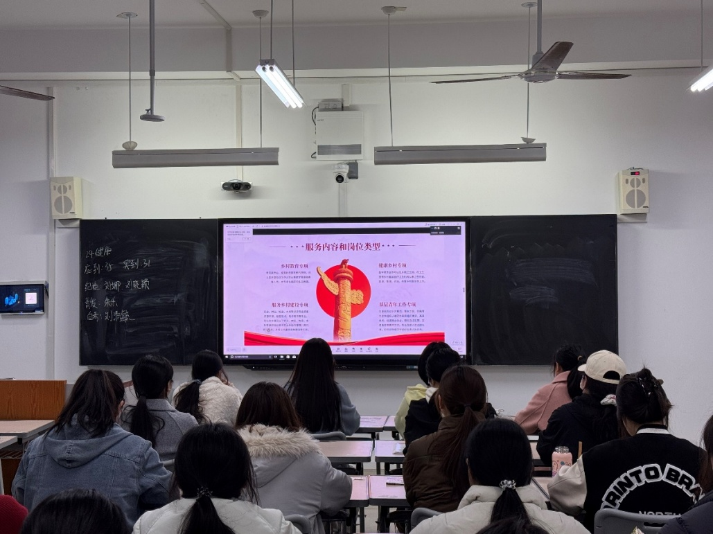 孙喆结合在河南省台前县的志愿服务经历,向大家分享自己在基层岗位上的服务经历和成长收获。在“互动答疑”环节,孙喆针对“服务年限”“选拔难度 ”“基层适应性”等高频问题耐心解答。他强调,基层服务不仅需要奉献精神,更需要将专业优势转化为服务效能,希望师弟师妹们积极参与西部计划,为西部发展贡献青春力量,在服务基层中书写“请党放心,强国有我”的青春答卷。