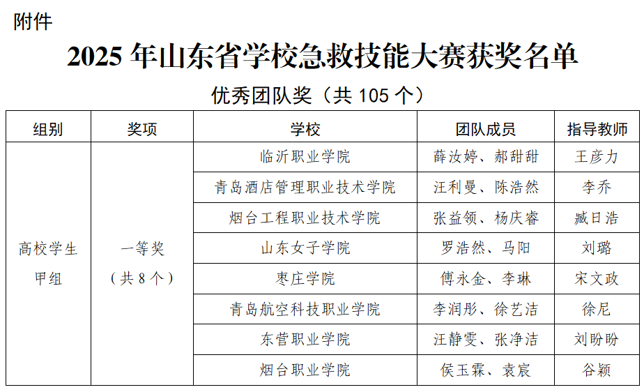近日,山东省教育厅公示了第三届学校急救知识与技能大赛获奖名单。我校太阳成集团tyc33455ccww2023级傅永金与2024级李琳两位同学,在宋文政、程琨老师的指导下,凭借扎实的理论基础、熟练的操作技能和出色的应急处理能力,荣获高校学生甲组(非医学大类专业)团体一等奖,宋文政老师同时获评“高校优秀指导教师奖”。