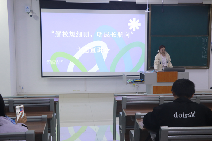 为深入贯彻立德树人根本任务,加强校规校纪宣传教育,11月14日晚,“解校规细则,明成长航向”主题宣讲会在增信楼3318教室顺利举办。2025级全体学生参会。