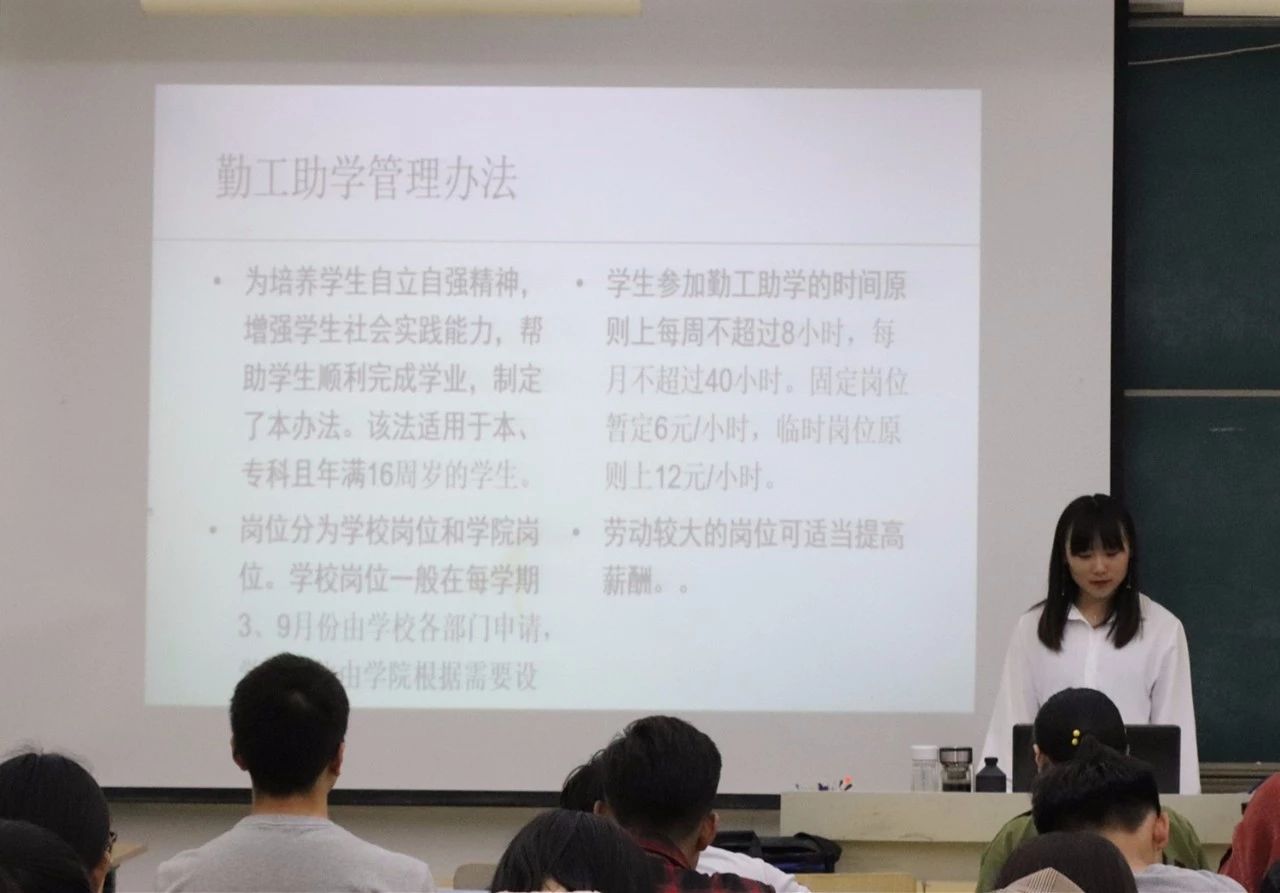 会议伊始,陈静详细介绍了贫困生认定条件、认定标准和认定流程,重点强调了评议流程及申请材料保存等相关事项;随后,胡静具体介绍了国家奖学金、省政府奖学金、励志奖学金、国家助学金的奖励标准、申请条件、评审过程和发放时间,并深入阐述了“建档立卡”的资助项目,让同学们对各项奖助学金有了全面了解;接着,郭俊德对太阳集团tyc33455“爱心银行”校内无息贷款、“爱心一日捐”学生资助、“同心光彩助学行动”等资助政策作出详细解读;最后,张希系统讲解了勤工助学的岗位设置、岗位酬金、申请条件及流程等勤工助学管理办法,促进勤工助学工作健康、有序开展。