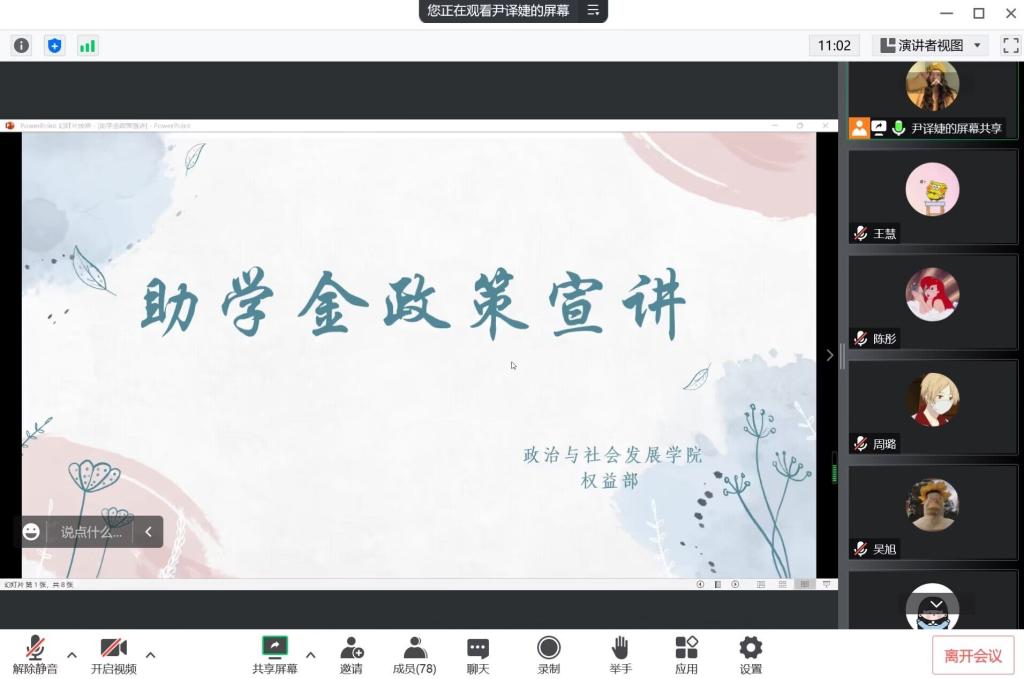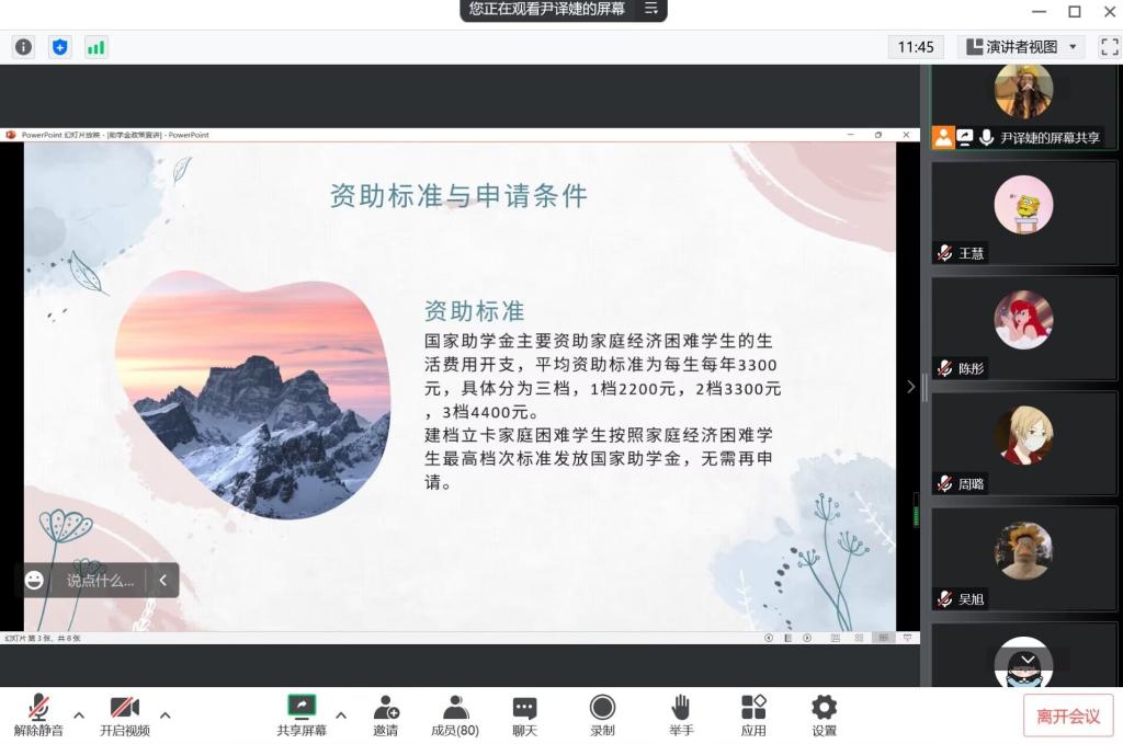 本次会议以线上会议的形式召开。会议中,主讲人带领同学们学习了学生奖助手册中的资助政策相关内容。活动开始,主持人首先对国家助学金、国家励志奖学金、省政府励志奖学金这三个部分进行了详细的讲解。其次,对各类奖助学金的申请条件及评选流程作了进一步说明。会议最后,鼓励同学们根据自身情况确定学习目标,勤勉好学,自强不息。宣讲会结束后,获得资助的学生纷纷表示要努力学习,回馈社会。