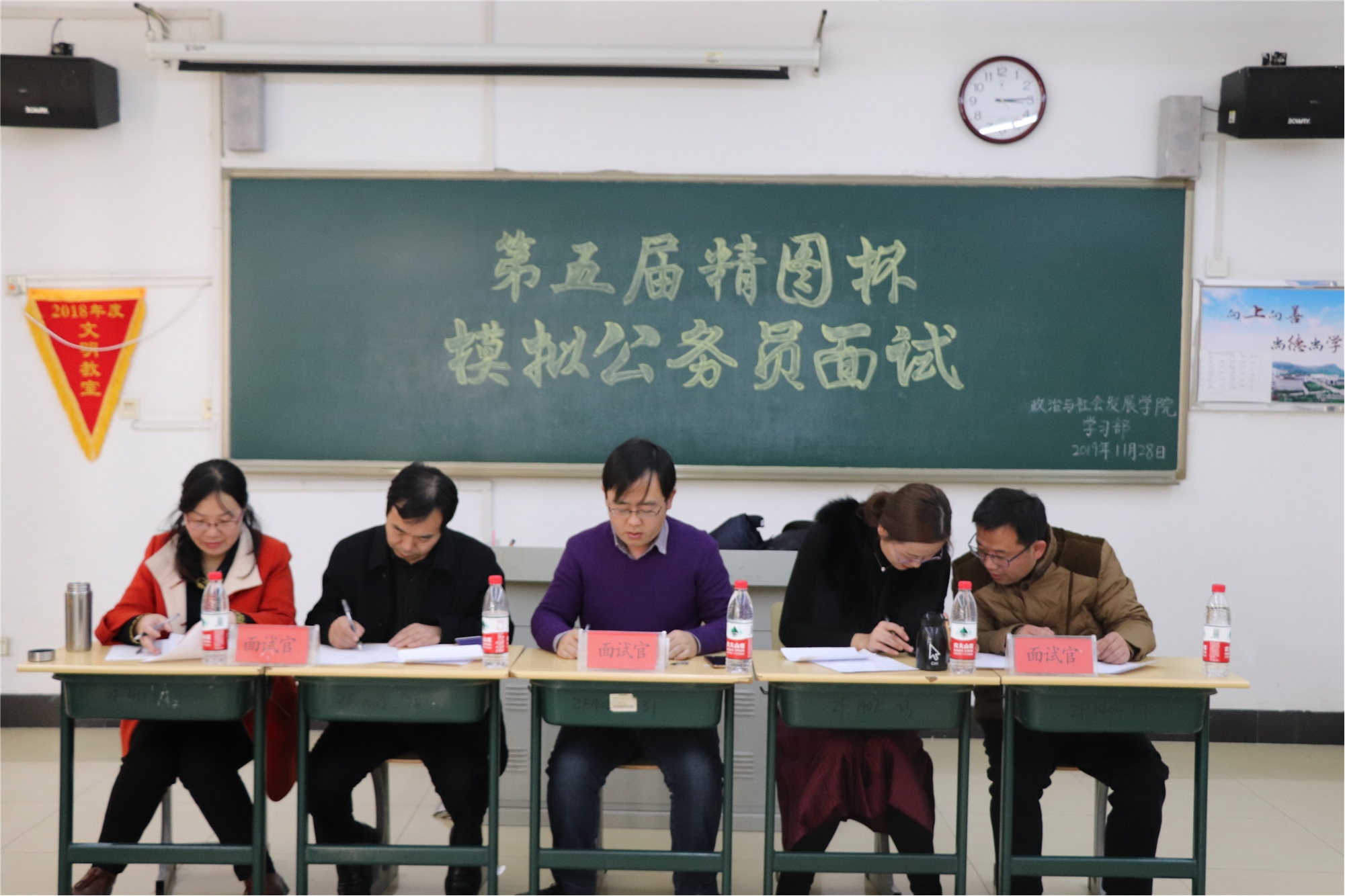 为加深应届毕业生对公务员考试政策的了解,提高应试能力和综合素质,我院于11月13、14日进行了公务员考试笔试环节模拟比赛,11月28日进行了面试环节模拟比赛。我院五位专业资深教师担任此次大赛的评委。
