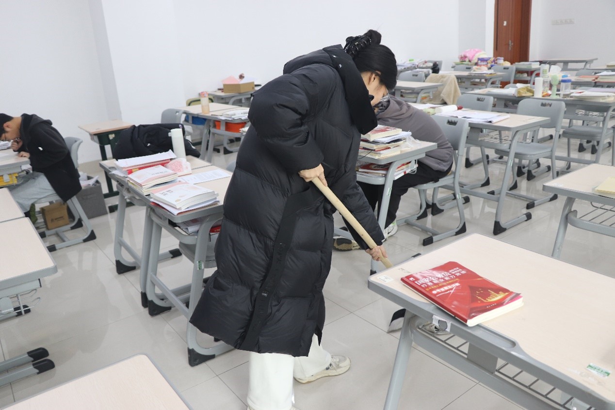 近日,我院学生会对考研教室进行了全面打扫,清洁地面、擦拭桌面、整理杂物,为考研学子营造了更加整洁、舒适的备考环境。
