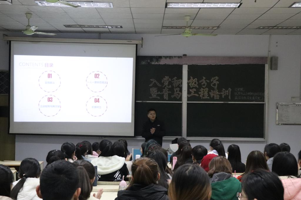 11月12日晚,文学院党总支书记史大丰在文科楼217教室为入党积极分子培训讲党课。