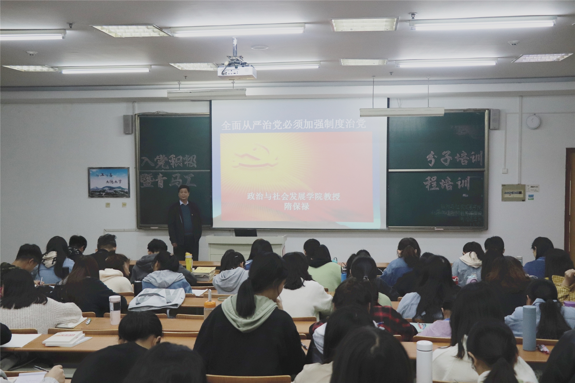 本次培训由我院副院长隋保禄主持,以主题党课的形式开展。会上,隋保禄紧密结合党的十九届四中全会等时政要闻,引出全面从严治党必须加强制度治党的课题,深刻阐述了制度治党思想的重要性和必要性,突出强调了加强治理能力和治理体系的现代化的要求。随后,隋保禄详细解读了制度治党的的历史演变过程、推进制度治党的基本路径和提升党的建设制度化水平的方法措施,使入党积极分子对依规治党有了更加深刻的理解。活动在热烈的掌声中圆满结束。